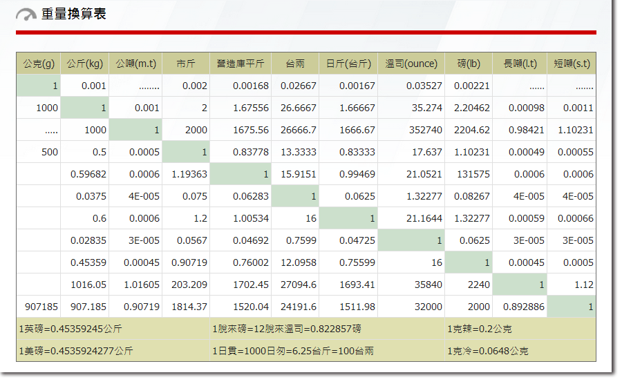 * 度量衡換算表等資料來源: 台北市度量衡商業同業公會 | 量測資訊網 | 單位換算轉換器
